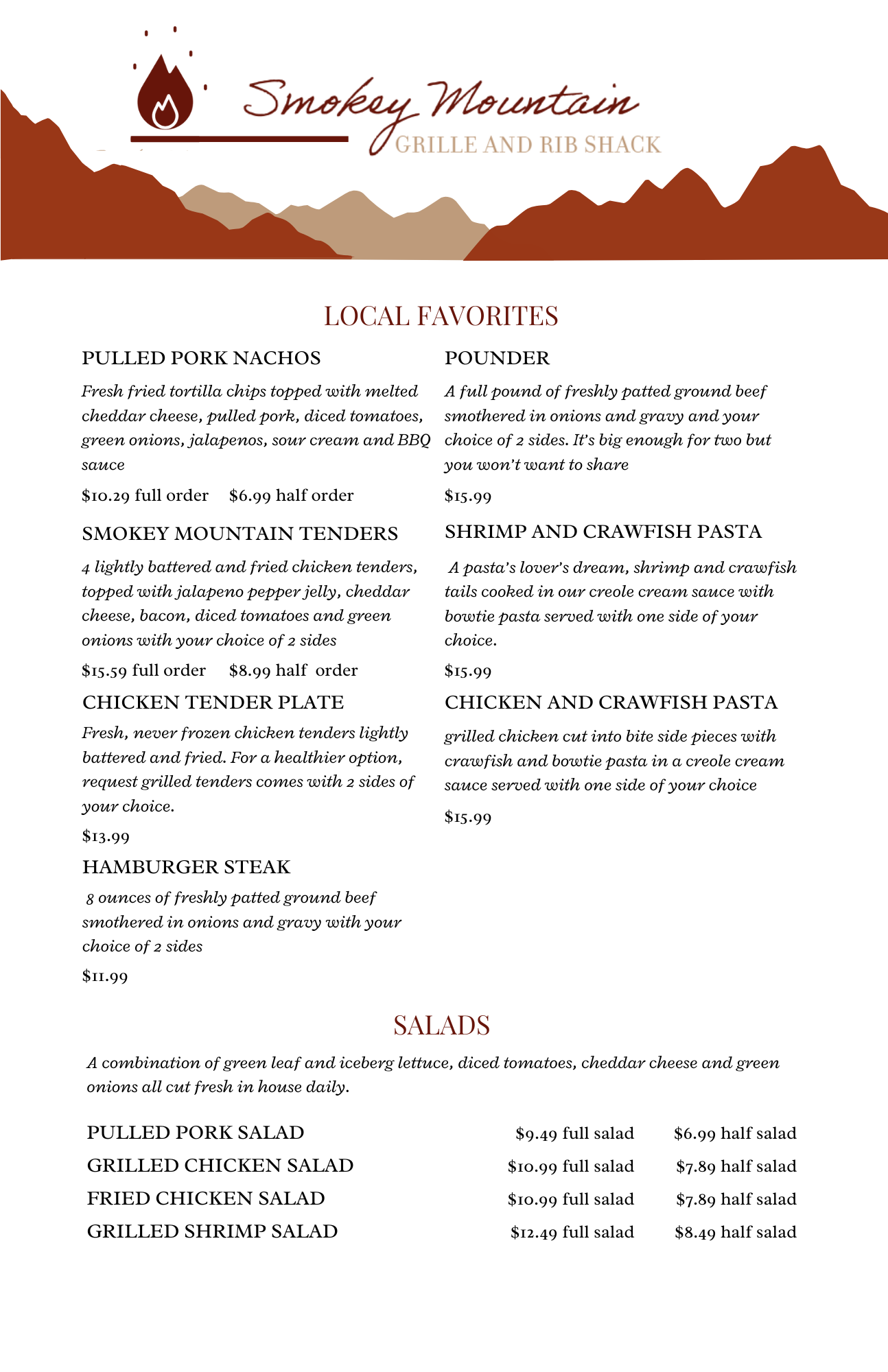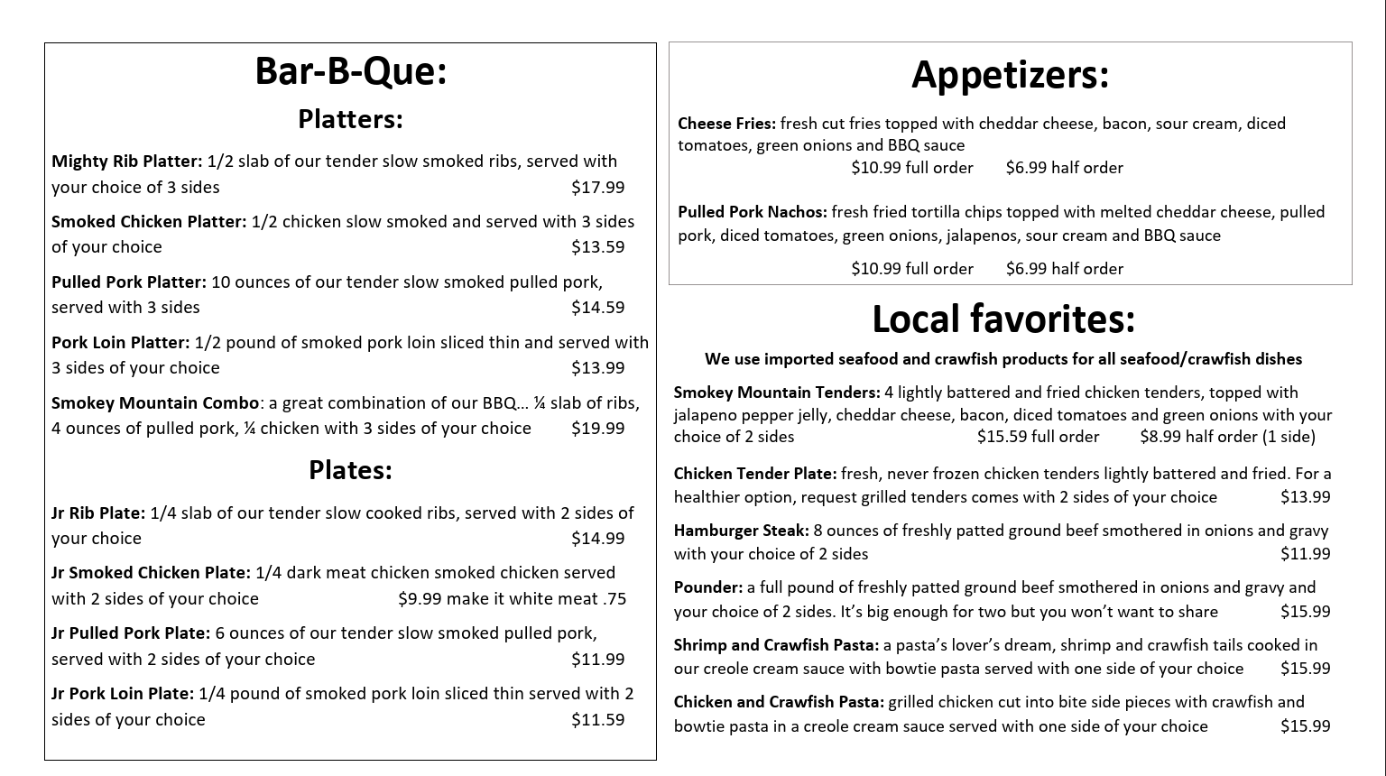 This project reimagines the visual identity of Smokey Mountain Grille, a rustic Southern eatery known for comfort food and warm hospitality. The redesign introduces a modernized flame-inspired logo, a warm color palette, and textured typography that evokes wood-fire cooking and Appalachian charm. The refreshed menu layout improves readability with clean sections, a minimalist style, and cohesive branding. Together, the updated brand and menu create a cohesive, elevated dining experience while preserving the restaurant’s classic Smokey Mountain spirit.